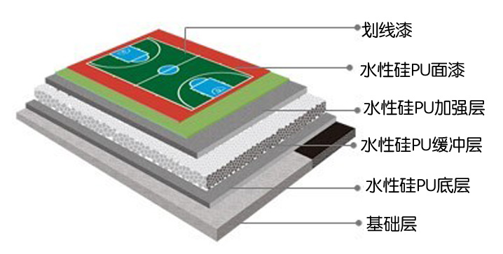 水性硅PU特有的羟基并加有机硅改性,三层复合结构组合"表硬里软",色彩丰富的耐磨、防污表层面层,软硬适中无溶剂环保中间弹性减震层,特别设计在新旧水泥基础上的防水底层。