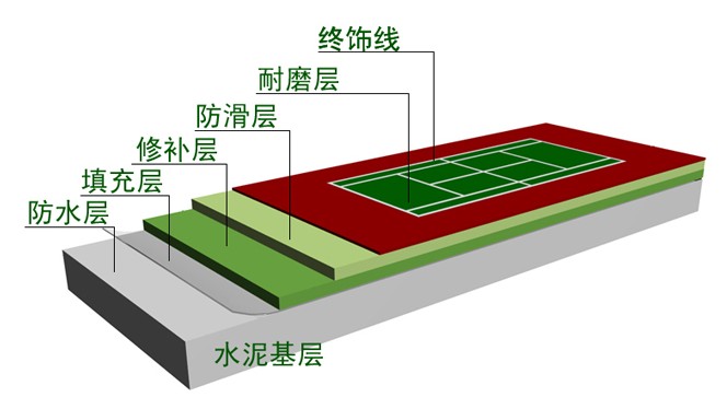 4、面层:由色彩鲜艳、抗紫外光的丙烯酸涂料铺成增加耐磨性。