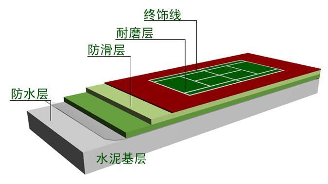 用丙烯酸色层基础材料加入适当的石英砂搅拌混和铺成,掺入石英砂的作用不仅是耐磨,而且也可以根据用量的多少来调节控制球速的快慢。