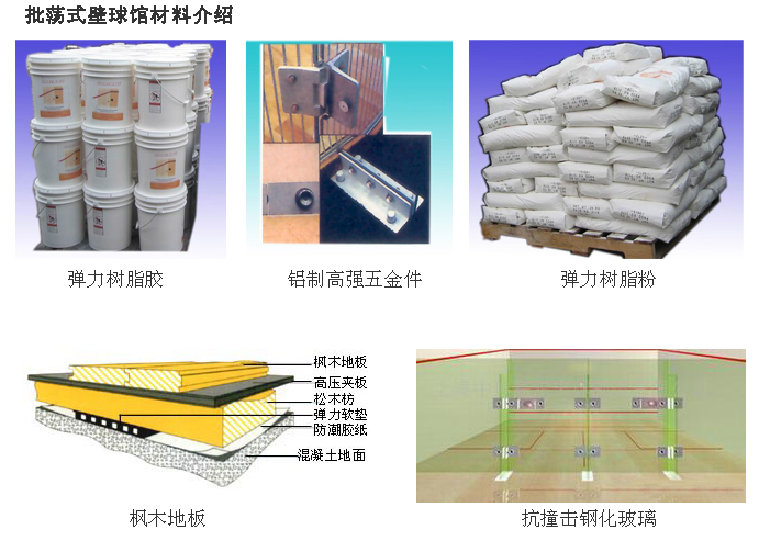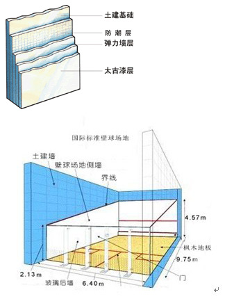 根据壁球场竞赛规则的要求,设计建造此类型壁球场。为了更好的使运动员完成各项运动。我们在砖及混凝土砌筑的墙面上,铺装弹性批荡树脂材料。批荡树脂铺装完毕后在表面滚涂面油层,颜色为白色或浅色。墙体铝合金界线及可调试响板,能有效反映球体是否出界。