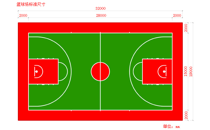 标准篮球场地为一块长32米,宽19米的长方形平地。比赛区为长28米,宽15米球场必须有明显的界线。室内篮球场天花板或最低障碍物高度至少7米,球场照明要均匀,光度要充足。灯光设备的安置不得妨碍队员的视觉。